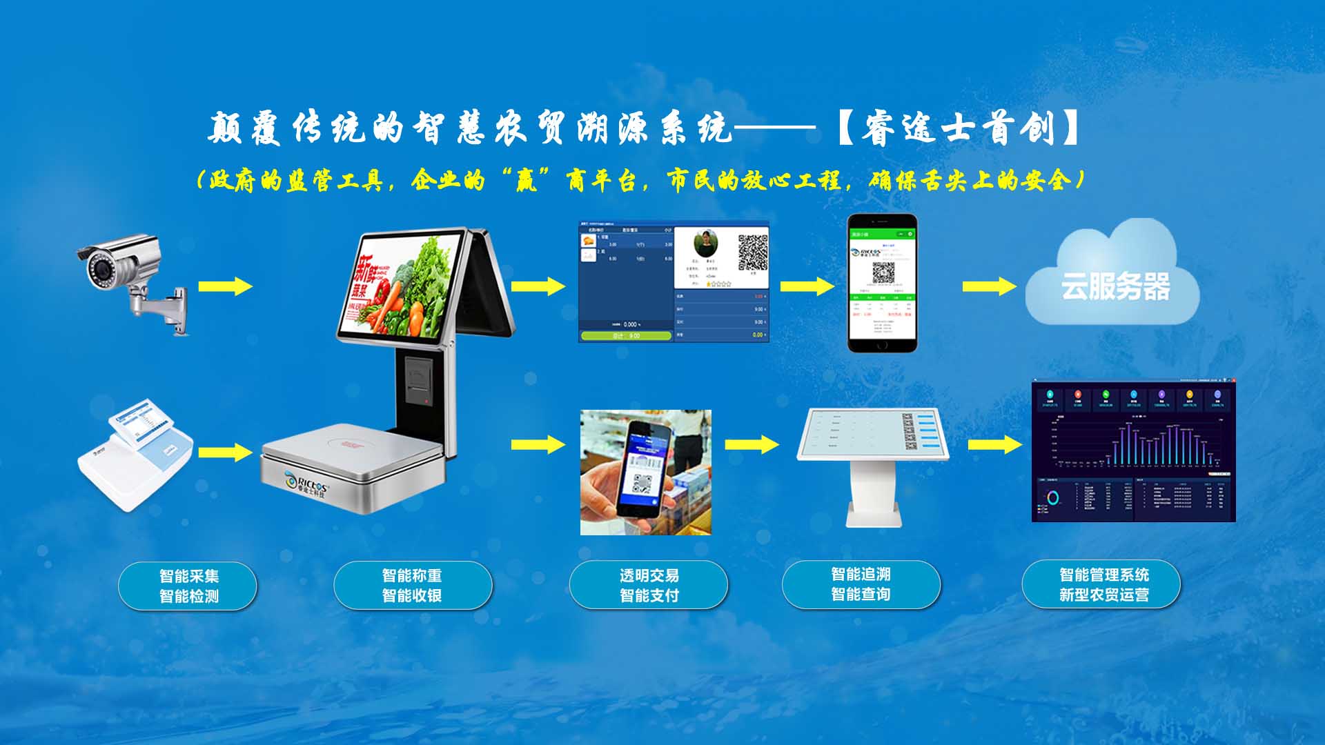 創(chuàng)新實(shí)現(xiàn)了【智慧農(nóng)貿(mào)溯源管理系統(tǒng)】與【智能稱重收銀】一體化解決方案,集市場(chǎng)管理、運(yùn)營(yíng)管理、溯源追溯、智能收銀大數(shù)據(jù)運(yùn)用于一體,硬件、軟件與管理系統(tǒng)完美結(jié)合。適用于農(nóng)批、農(nóng)貿(mào)市場(chǎng)蔬菜、生鮮、水果、水產(chǎn)、肉類、熟食等稱重和非稱重銷售;由于采用一體化設(shè)計(jì),解決了傳統(tǒng)農(nóng)貿(mào)市場(chǎng)無(wú)法實(shí)現(xiàn)的信息化、智能化、可追溯的管理問(wèn)題;使稱重、收銀、追溯、管理、更透明、公正、安全,讓顧客無(wú)后顧之憂,給管理工作帶來(lái)極大的便捷與高效,對(duì)國(guó)內(nèi)農(nóng)產(chǎn)品行業(yè)的發(fā)展、農(nóng)產(chǎn)品流通管理起到了典范作用。 【睿途士首創(chuàng)】顛覆傳統(tǒng)的“智慧農(nóng)貿(mào)市場(chǎng)系統(tǒng)”,解決了傳統(tǒng)農(nóng)貿(mào)系統(tǒng)單一安卓掛屏,昂視不方便看、不直觀、無(wú)互動(dòng)性,傳輸信息不齊全、不穩(wěn)定的問(wèn)題,也解決了按鍵電子秤商品難找、商品代碼難記、按鍵操作不靈活、支付不智能,對(duì)收銀管理、銷售商品、菜名、菜價(jià)、打折、優(yōu)惠、會(huì)員、線上下單、采購(gòu)等無(wú)法實(shí)現(xiàn)實(shí)際菜品交易和追溯等問(wèn)題。 更具顛覆性的是睿途士智慧系統(tǒng)擁有三大管理平臺(tái)(市場(chǎng)管理平臺(tái)、總部運(yùn)營(yíng)管理平臺(tái)、商戶后臺(tái)管理平臺(tái))、一個(gè)可視操作前臺(tái)和三大追溯功能,讓遠(yuǎn)程管理、數(shù)據(jù)傳輸、人機(jī)互動(dòng)、智能控制、移動(dòng)支付、大數(shù)據(jù)、互聯(lián)通信、云端存儲(chǔ)、人工智能、智能城市、電子定位、智能收銀等功能得以實(shí)現(xiàn)。